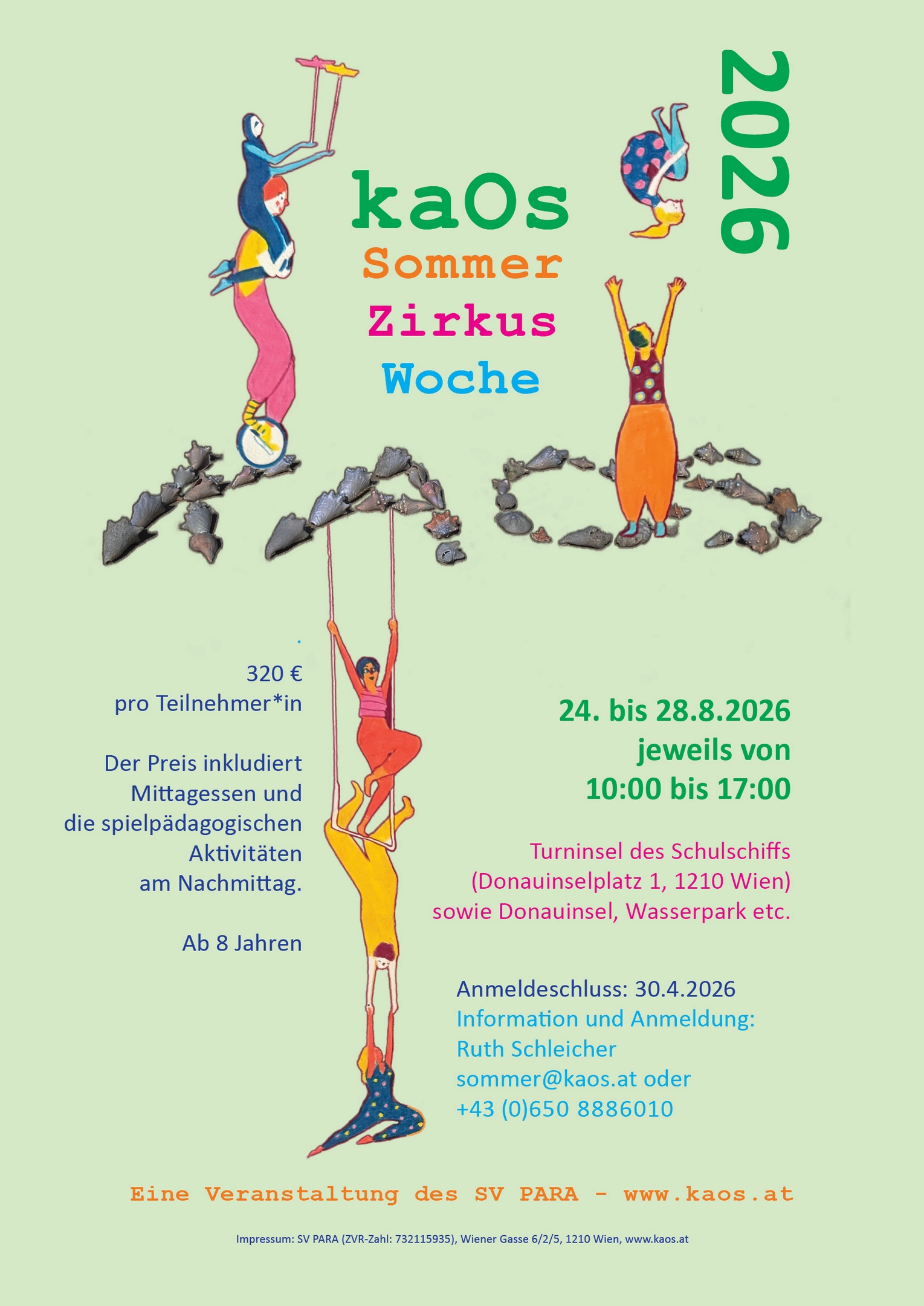 In the last couple of years the kaOs Summer Circus Day Camp has established itself on our “circus” ship (gymnasium of the Schulschiff, Donauinselplatz 1, 1210 Vienna). Young people come together for five days so they can set out to do circus, to eat, to play and to laugh together. The “circus” ship is suited perfectly for the training of various circus arts and the adjacent Donauinsel is great for all outdoor afternoon activities. Traditionally every year new equipment and kaOs designs are offered apart from the customary circus materials.