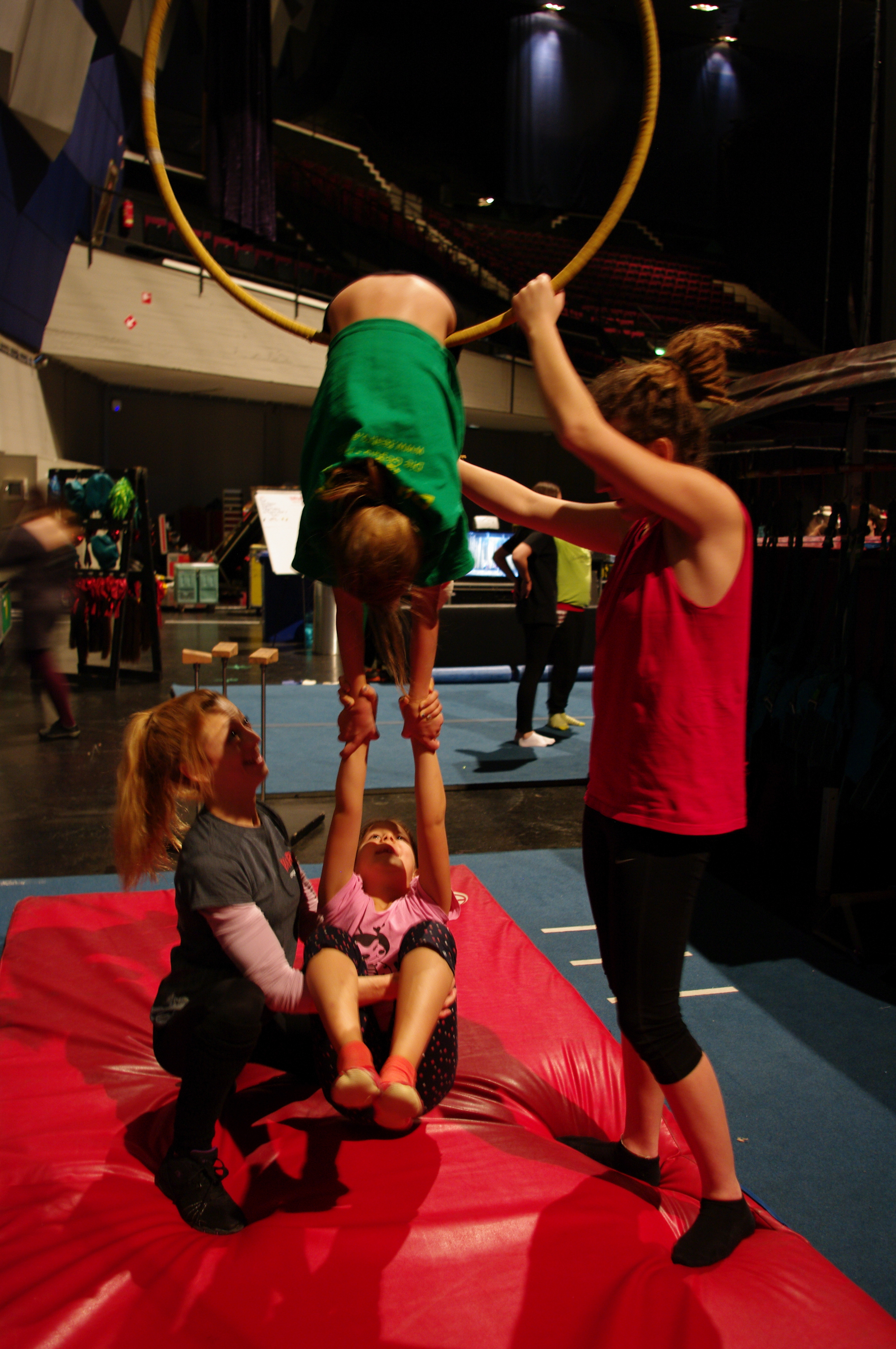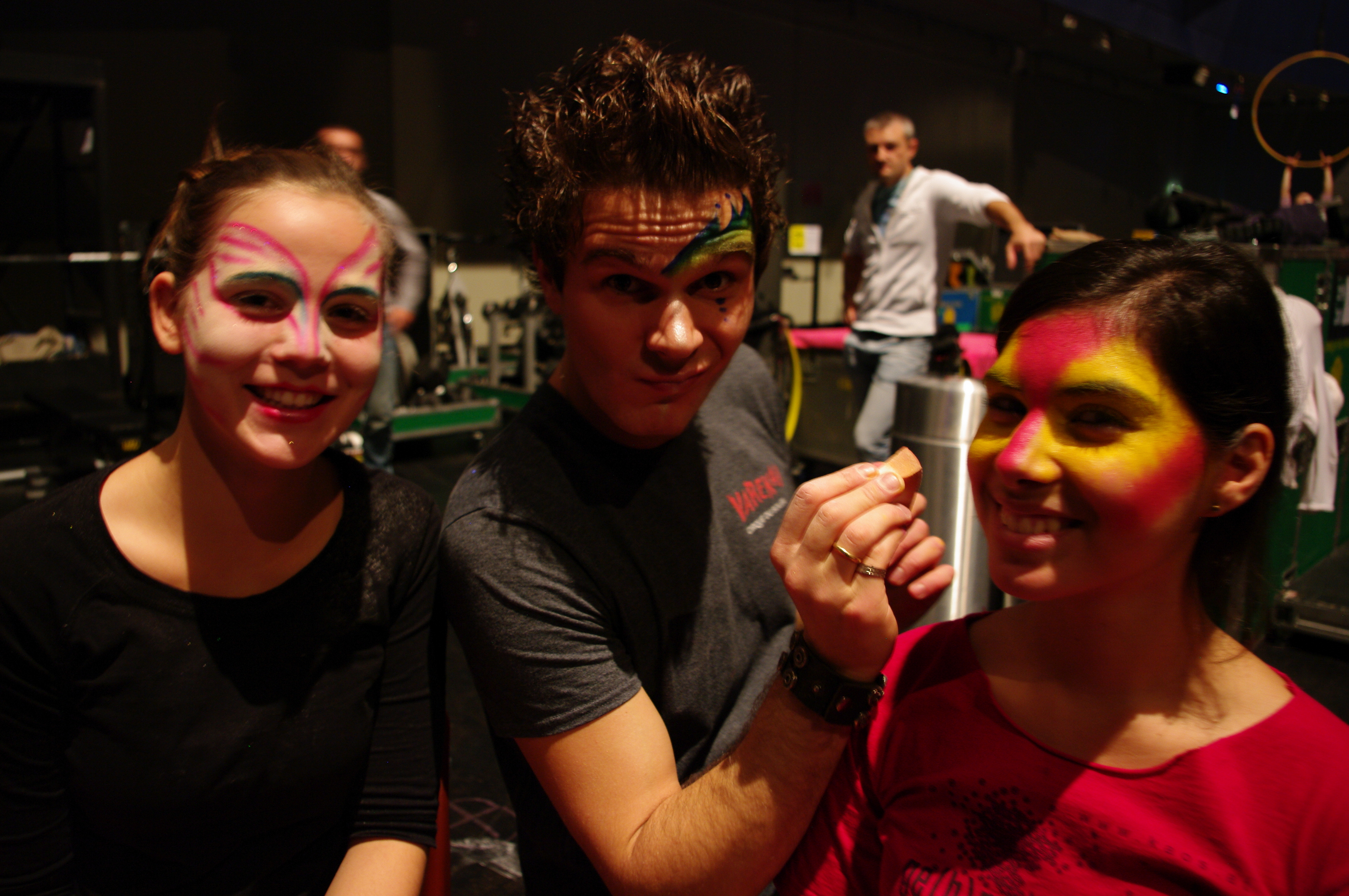 On the 5th of November 2015, we and the Slovak circus Cirkus-kus had the one-of-a-kind opportunity to train with artists from Cirque du Soleil. Workshops in the areas of acrobatics, clowning, masks, make-up, aerial hoop and jumping stilts took place on and behind the scenes at Stadthalle. It was a wonderful and impressive experience!